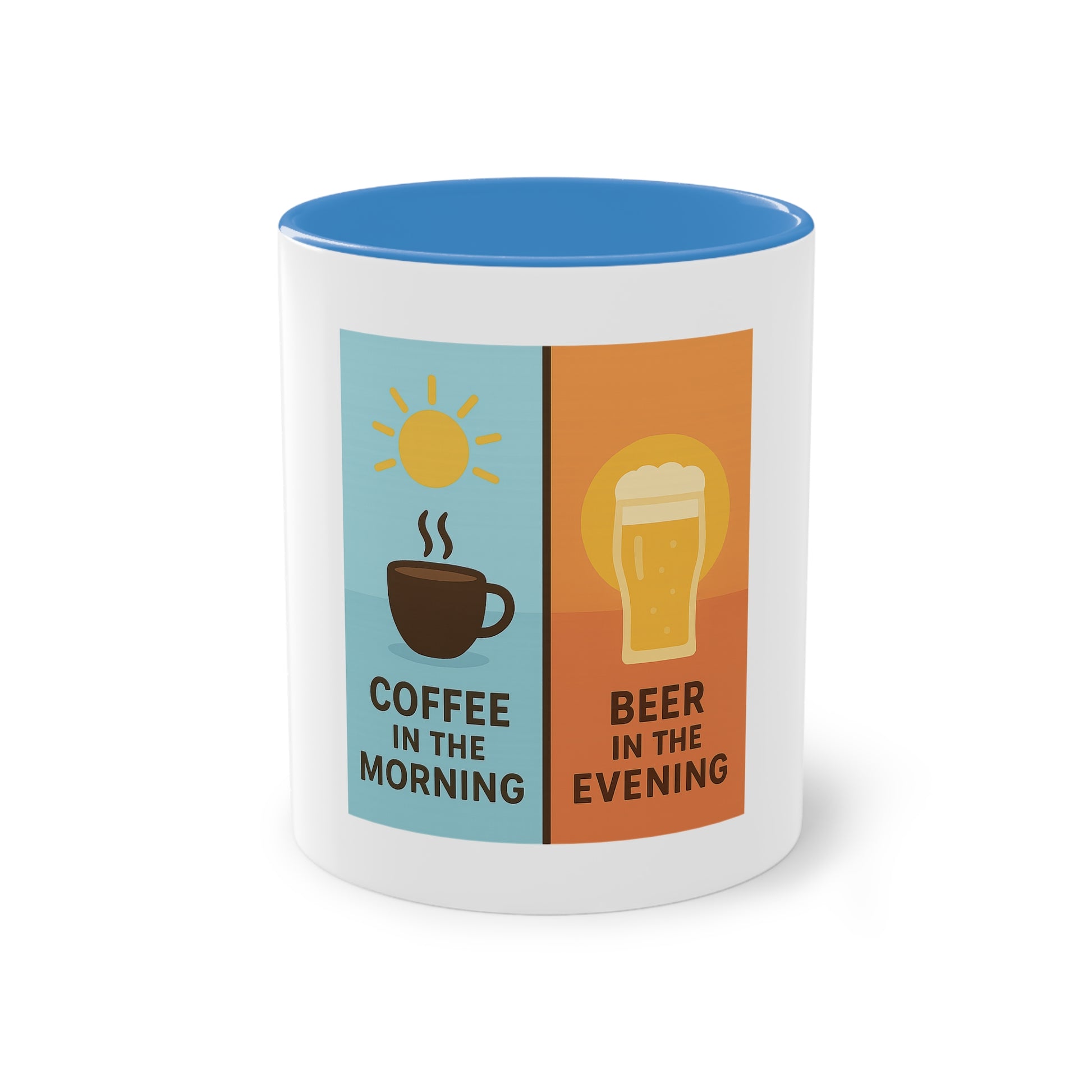 Zweifarbige Kaffeetasse: Morgens Kaffee, abends Bier.